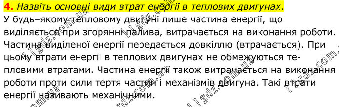 4. Назвіть основні види втрат енергії в теплових двигунах. У будь–якому тепловому двигуні лише частина енергії, що виділяється при згорянні палива, витрачається на виконання роботи. Частина виділеної енергії передається довкіллю (втра-чається). При цьому втрати енергії в теплових двигунах не обмежуються те¬пловими втратами. Частина енергії та¬кож витрачається на виконання роботи проти сили тертя частин і механізмів двигуна. Такі втрати енергії називають механічними.