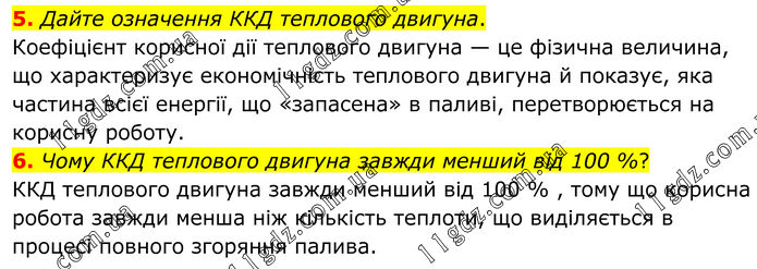 5. Дайте означення ККД теплового двигуна. Коефіцієнт корисної дії теплового двигуна — це фізична величина, що характеризує економічність теплового двигуна й показує, яка частина всієї енергії, що «запасена» в паливі, пере¬творюється на корисну роботу. 6. Чому ККД теплового двигуна завжди менший від 100 %? ККД теплового двигуна завжди мен¬ший від 100 % , тому що корисна робота завжди менша ніж кількість теплоти, що виділяється в процесі повного зго¬ряння палива.