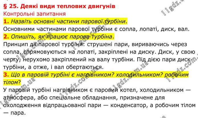 § 25. Деякі види теплових двигунів Контрольні запитання 1. Назвіть основні частини парової турбіни. Основними частинами парової турбіни є сопла, лопаті, диск, вал. 2. Опишіть, як працює парова турбіна. Принцип дії парової турбіни: стру¬шені пари, вириваючись через сопла, спрямовуються на лопаті, закріплені на диску. Диск, у свою чергу, нерухомо закріплений на валу турбіни. Під дією пари диск турбіни, а отже, і вал обер¬таються. 3. Що в паровій турбіні є нагрівником? холодильником? робочим тілом? У паровій турбіні нагрівником є паровий котел, холодильником — атмосфера, або спеціальне обладнання, призначене для охолодження відпра¬цьованої пари — конденсатор, а робо¬чим тілом — пара.