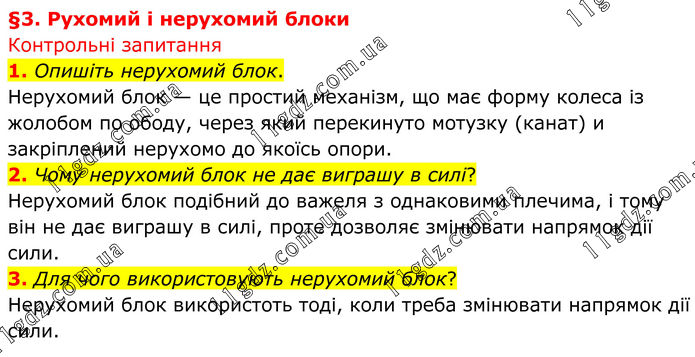 Контрольні запитання 1. Опишіть нерухомий блок. Нерухомий блок — це простий механізм, що має форму колеса із жолобом по ободу, через який перекинуто мотузку (канат) и закріплений нерухомо до якоїсь опори. 2. Чому нерухомий блок не дає виграшу в силі? Нерухомий блок подібний до важеля з однаковими плечима, і тому він не дає виграшу в силі, проте дозволяє змінювати напрямок дії сили. 3. Для чого використовують нерухомий блок? Нерухомий блок використоть тоді, коли треба змінювати напрямок дії сили.
