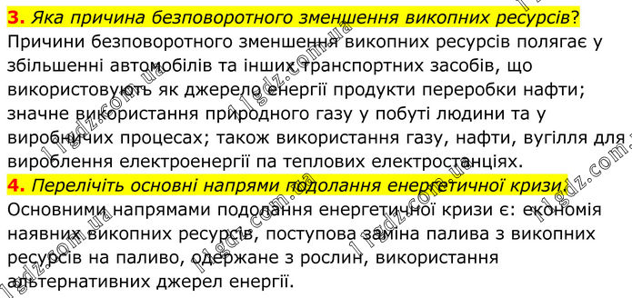 3. Яка причина безповоротного зменшення викопних ресурсів? Причини безповоротного зменшення викопних ресурсів полягає у збільшенні автомобілів та інших транспортних засобів, що використовують як джерело енергії продукти переробки нафти; значне використання природного газу у побуті людини та у виробничих процесах; також використання газу, нафти, вугілля для вироблення електроенергії па теплових електростанціях. 4. Перелічіть основні напрями подолання енергетичної кризи. Основними напрямами подолання енергетичної кризи є: економія наявних викопних ресурсів, поступова заміна палива з викопних ресурсів на паливо, одержане з рослин, використання альтернативних джерел енергії.