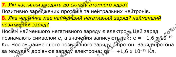 7. Які частинки входять до складу атомного ядра? Позитивно заряджених протонів та нейтральних нейтронів. 8. Яка частинка має найменший негативний заряд? найменший позитивний заряд? Носієм найменшого негативного заряду є електрон. Цей заряд позначають символом е, а значення записують так: е = –1,6 • 10–19 Кл. Носієм найменшого позитивного заряду є протон. Заряд протона за модулем дорівнює заряду електрона: qп = +1,6 • 10–19 Кл.