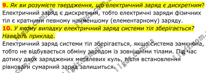 9. Як ви розумієте твердження, що електричний заряд є дискретним? Електричний заряд є дискретним, тобто електричні заряди фізичних тіл є кратними певному найменшому (елементарному) заряду. 10. У якому випадку електричний заряд системи тіл зберігається? Наведіть приклад. Електричний заряд системи тіл зберігається, якщо система замкнена, тобто не відбувається обміну зарядом із зовнішніми тілами. Під час дотику двох заряджених металевих куль, після встановлення рівноваги сумарний заряд залишиться.