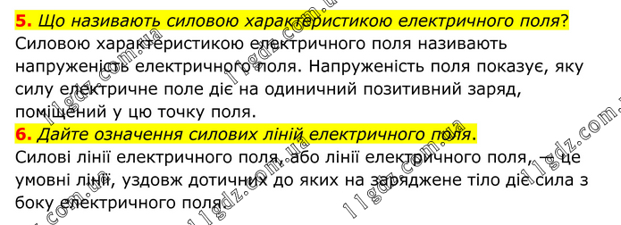5. Що називають силовою характеристикою електричного поля? Силовою характеристикою електричного поля називають напруженість електричного поля. Напруженість поля показує, яку силу електричне поле діє на одиничний позитивний заряд, поміщений у цю точку поля. 6. Дайте означення силових ліній електричного поля. Силові лінії електричного поля, або лінії електричного поля, — це умовні лінії, уздовж дотичних до яких на заряджене тіло діє сила з боку електричного поля.