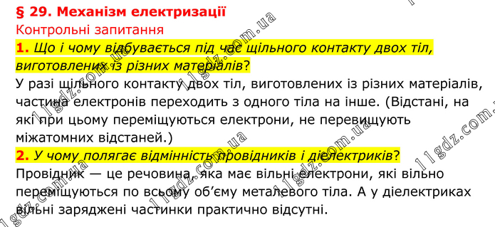 § 29. Механізм електризації Контрольні запитання 1. Що і чому відбувається під час щільного контакту двох тіл, виготовлених із різних матеріалів? У разі щільного контакту двох тіл, виготовлених із різних матеріалів, частина електронів переходить з одного тіла на інше. (Відстані, на які при цьому переміщуються електрони, не перевищують міжатомних відстаней.) 2. У чому полягає відмінність провідників і діелектриків? Провідник — це речовина, яка має вільні електрони, які вільно переміщуються по всьому об’єму металевого тіла. А у діелектриках вільні заряджені частинки практично відсутні.