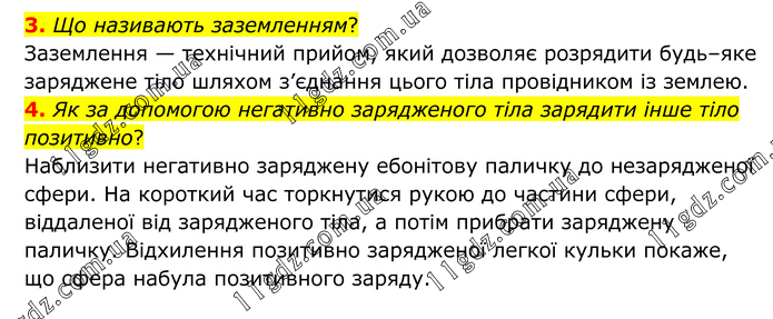 3. Що називають заземленням? Заземлення — технічний прийом, який дозволяє розрядити будь–яке заряджене тіло шляхом з’єднання цього тіла провідником із землею. 4. Як за допомогою негативно зарядженого тіла зарядити інше тіло позитивно? Наблизити негативно заряджену ебонітову паличку до незарядженої сфери. На короткий час торкнутися рукою до частини сфери, віддаленої від зарядженого тіла, а потім прибрати заряджену паличку. Відхилення позитивно зарядженої легкої кульки покаже, що сфера набула позитивного заряду.