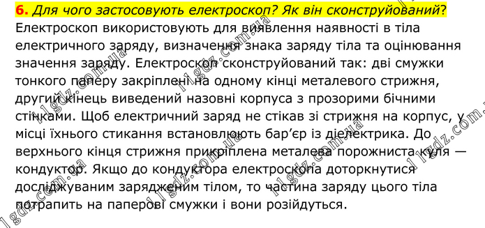 Для чого застосовують електроскоп? Як він сконструйований? Електроскоп використовують для виявлення наявності в тіла електричного заряду, визначення знака заряду тіла та оцінювання значення заряду. Електроскоп сконструйований так: дві смужки тонкого паперу закріплені на одному кінці металевого стрижня, другий кінець виведений назовні корпуса з прозорими бічними стінками. Щоб електричний заряд не стікав зі стрижня на корпус, у місці їхнього стикання встановлюють бар’єр із діелектрика. До верхнього кінця стрижня прикріплена металева порожниста куля — кондуктор. Якщо до кондуктора електроскопа доторкнутися досліджуваним зарядженим тілом, то частина заряду цього тіла потрапить на паперові смужки і вони розійдуться.
