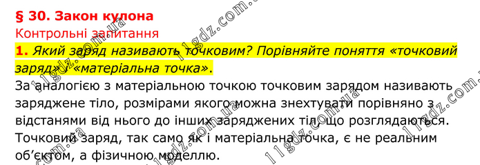 § 30. Закон кулона Контрольні запитання 1. Який заряд називають точковим? Порівняйте поняття «точковий заряд» і «матеріальна точка». За аналогією з матеріальною точкою точковим зарядом називають заряджене тіло, розмірами якого можна знехтувати порівняно з відстанями від нього до інших заряджених тіл, що розглядаються. Точковий заряд, так само як і матеріальна точка, є не реальним об’єктом, а фізичною моделлю.