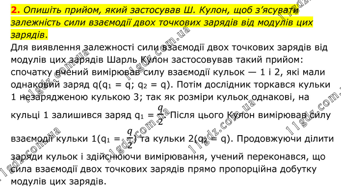 2. Опишіть прийом, який застосував Ш. Кулон, щоб з’ясувати залежність сили взаємодії двох точкових зарядів від модулів цих зарядів. Для виявлення залежності сили взаємодії двох точкових зарядів від модулів цих зарядів Шарль Кулон застосовував такий прийом: спочатку вчений вимірював силу взаємодії кульок — 1 і 2, які мали однаковий заряд q(q1 = q; q2 = q). Потім дослідник торкався кульки 1 незарядженою кулькою 3; так як розміри кульок однакові, на кульці 1 залишився заряд q1 = q/2. Після цього Кулон вимірював силу взаємодії кульки 1(q1 = q/2) та кульки 2(q2 = q). Продовжуючи ділити заряди кульок і здійснюючи вимірювання, учений переконався, що сила взаємодії двох точкових зарядів прямо пропорційна добутку модулів цих зарядів.