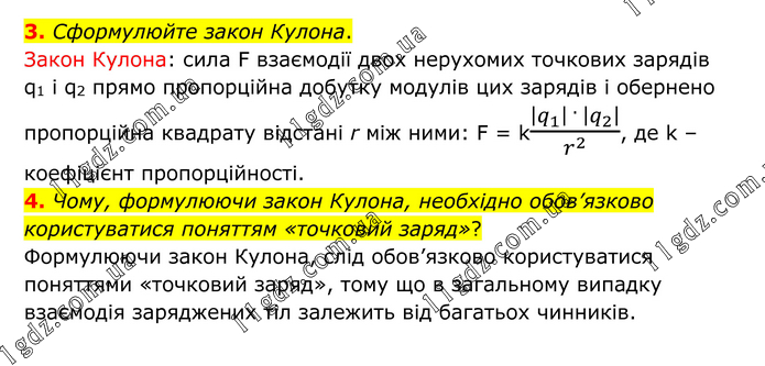 3. Сформулюйте закон Кулона. Закон Кулона: сила F взаємодії двох нерухомих точкових зарядів q1 i q2 прямо пропорційна добутку модулів цих зарядів і обернено пропорційна квадрату відстані r між ними: F = k(|q_1 | · |q_2 |)/r^2 , де k – коефіцієнт пропорційності. 4. Чому, формулюючи закон Кулона, необхідно обов’язково користуватися поняттям «точковий заряд»? Формулюючи закон Кулона, слід обов’язково користуватися поняттями «точковий заряд», тому що в загальному випадку взаємодія заряджених тіл залежить від багатьох чинників.
