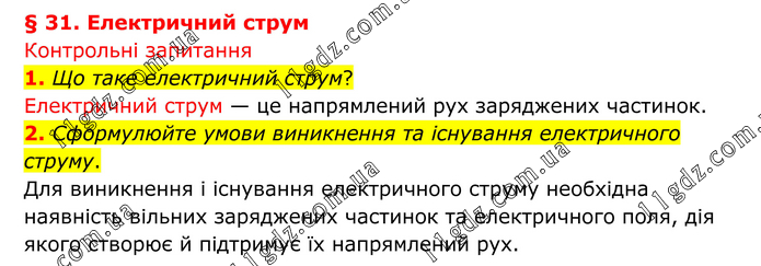 § 31. Електричний струм Контрольні запитання 1. Що таке електричний струм? Електричний струм — це напрямлений рух заряджених частинок. 2. Сформулюйте умови виникнення та існування електричного струму. Для виникнення і існування електричного струму необхідна наявність вільних заряджених частинок та електричного поля, дія якого створює й підтримує їх напрямлений рух.