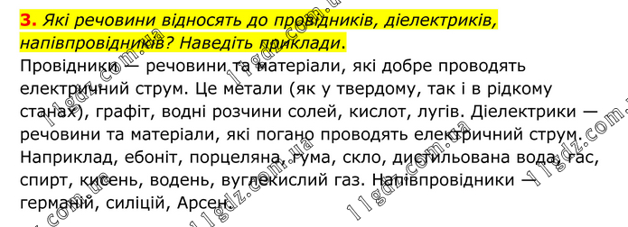 3. Які речовини відносять до провідників, діелектриків, напівпровідників? Наведіть приклади. Провідники — речовини та матеріали, які добре проводять електричний струм. Це метали (як у твердому, так і в рідкому станах), графіт, водні розчини солей, кислот, лугів. Діелектрики — речовини та матеріали, які погано проводять електричний струм. Наприклад, ебоніт, порцеляна, гума, скло, дистильована вода, гас, спирт, кисень, водень, вуглекислий газ. Напівпровідники — германій, силіцій, Арсен.