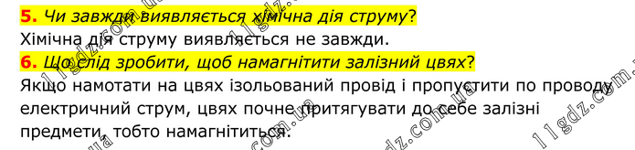 5. Чи завжди виявляється хімічна дія струму? Хімічна дія струму виявляється не завжди. 6. Що слід зробити, щоб намагнітити залізний цвях? Якщо намотати на цвях ізольований провід і пропустити по проводу електричний струм, цвях почне притягувати до себе залізні предмети, тобто намагнітиться.