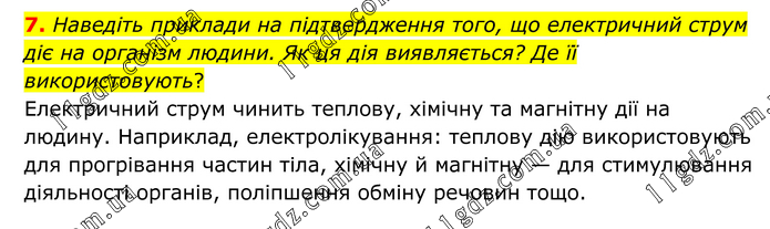 7. Наведіть приклади на підтвердження того, що електричний струм діє на організм людини. Як ця дія виявляється? Де її використовують? Електричний струм чинить теплову, хімічну та магнітну дії на людину. Наприклад, електролікування: теплову дію використовують для прогрівання частин тіла, хімічну й магнітну — для стимулювання діяльності органів, поліпшення обміну речовин тощо.