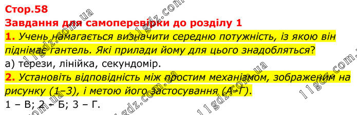 Завдання для самоперевірки до розділу 1 1. Учень намагається визначити середню потужність, із якою він піднімає гантель. Які прилади йому для цього знадобляться? а) терези, лінійка, секундомір. 2. Установіть відповідність між простим механізмом, зображеним на рисунку (1–3), і метою його застосування (А–Г). 1 – В; 2 – Б; 3 – Г.