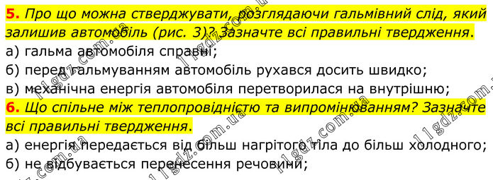 5. Про що можна стверджувати, розглядаючи гальмівний слід, який залишив автомобіль (рис. 3)? Зазначте всі правильні твердження. а) гальма автомобіля справні; б) перед гальмуванням автомобіль рухався досить швидко; в) механічна енергія автомобіля перетворилася на внутрішню; 6. Що спільне між теплопровідністю та випромінюванням? Зазначте всі правильні твердження. а) енергія передається від більш нагрітого тіла до більш холодного; б) не відбувається перенесення речовини;