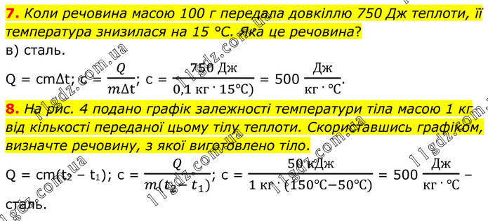 7. Коли речовина масою 100 г передала довкіллю 750 Дж теплоти, її температура знизилася на 15 °С. Яка це речовина? в) сталь. Q = cm∆t; c = Q/m∆t; c = (750 Дж)/(0,1 кг · 15℃)) = 500 Дж/(кг · ℃). 8. На рис. 4 подано графік залежності температури тіла масою 1 кг від кількості переданої цьому тілу теплоти. Скориставшись графіком, визначте речовину, з якої виготовлено тіло. Q = cm(t2 – t1); c = Q/(m(t_2- t_1)); c = (50 кДж)/(1 кг · (150℃-50℃)) = 500 Дж/(кг · ℃) – сталь.