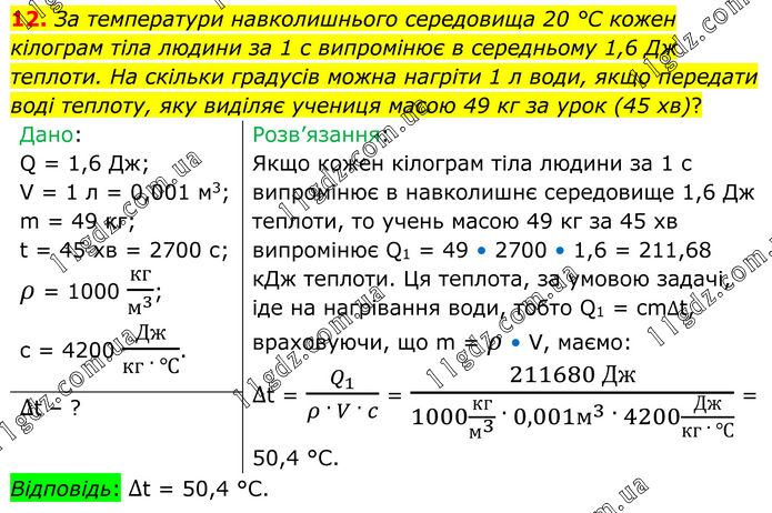 12. За температури навколишнього середовища 20 °С кожен кілограм тіла людини за 1 с випромінює в середньому 1,6 Дж теплоти. На скільки градусів можна нагріти 1 л води, якщо передати воді теплоту, яку виділяє учениця масою 49 кг за урок (45 хв)? Дано: Q = 1,6 Дж; V = 1 л = 0,001 м3; m = 49 кг; t = 45 хв = 2700 с; ρ = 1000 кг/м^3 ; c = 4200 Дж/(кг · ℃). Розв’язання: Якщо кожен кілограм тіла людини за 1 с випромінює в навколишнє середовище 1,6 Дж теплоти, то учень масою 49 кг за 45 хв випромінює Q1 = 49 • 2700 • 1,6 = 211,68 кДж теплоти. Ця теплота, за умовою задачі, іде на нагрівання води, тобто Q1 = cm∆t, враховуючи, що m = ρ • V, маємо: ∆t = Q_1/(ρ · V · c) = (211680 Дж)/(1000 кг/м^3 · 0,001м^3 · 4200 Дж/(кг · ℃)) = 50,4 °С. ∆t – ? Відповідь: ∆t = 50,4 °С.