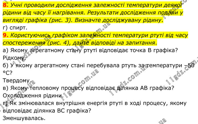 8. Учні проводили дослідження залежності температури деякої рідини від часу її нагрівання. Результати дослідження подали у вигляді графіка (рис. 3). Визначте досліджувану рідину. г) спирт. 9. Користуючись графіком залежності температури ртуті від часу спостереження (рис. 4), дайте відповіді на запитання. а) Якому агрегатному стану ртуті відповідає точка В графіка? Рідкому. б) У якому агрегатному стані перебувала ртуть за температури –50 °С? Твердому. в) Якому тепловому процесу відповідає ділянка AB графіка? Охолодження рідини. г) Як змінювалася внутрішня енергія ртуті в ході процесу, якому відповідає ділянка BC графіка? Зменшувалась.