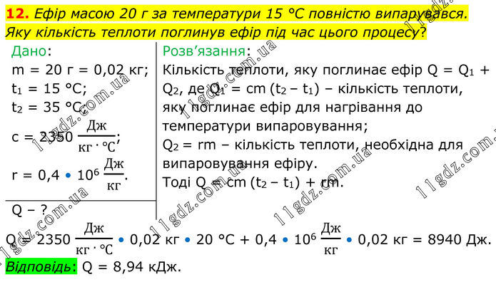 12. Ефір масою 20 г за температури 15 °С повністю випарувався. Яку кількість теплоти поглинув ефір під час цього процесу? Дано: m = 20 г = 0,02 кг; t1 = 15 °С; t2 = 35 °С; c = 2350 Дж/(кг · ℃); r = 0,4 • 106 Дж/кг. Розв’язання: Кількість теплоти, яку поглинає ефір Q = Q1 + Q2, де Q1 = cm (t2 – t1) – кількість теплоти, яку поглинає ефір для нагрівання до температури випаровування; Q2 = rm – кількість теплоти, необхідна для випаровування ефіру. Тоді Q = cm (t2 – t1) + rm. Q – ? Q = 2350 Дж/(кг · ℃) • 0,02 кг • 20 °С + 0,4 • 106 Дж/кг • 0,02 кг = 8940 Дж. Відповідь: Q = 8,94 кДж.