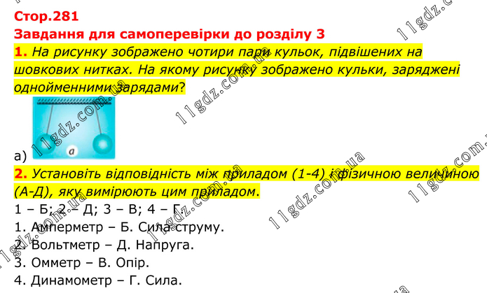 Завдання для самоперевірки до розділу 3 1. На рисунку зображено чотири пари кульок, підвішених на шовкових нитках. На якому рисунку зображено кульки, заряджені однойменними зарядами? а) 2. Установіть відповідність між приладом (1-4) і фізичною величиною (А-Д), яку вимірюють цим приладом. 1 – Б; 2 – Д; 3 – В; 4 – Г. 1. Амперметр – Б. Сила струму. 2. Вольтметр – Д. Напруга. 3. Омметр – В. Опір. 4. Динамометр – Г. Сила.