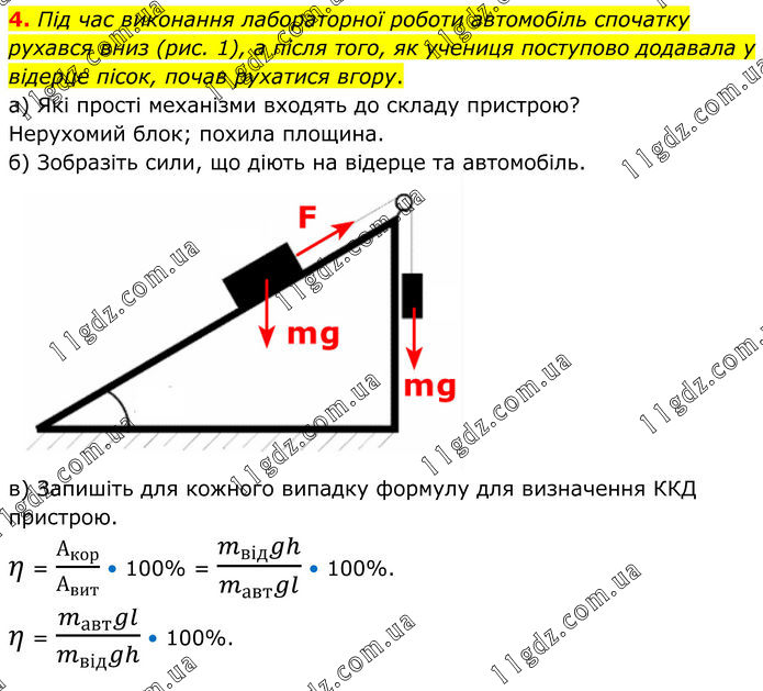 Під час виконання лабораторної роботи автомобіль спочатку рухався вниз (рис. 1), а після того, як учениця поступово додавала у відерце пісок, почав рухатися вгору. а) Які прості механізми входять до складу пристрою? Нерухомий блок; похила площина. б) Зобразіть сили, що діють на відерце та автомобіль. в) Запишіть для кожного випадку формулу для визначення ККД пристрою. η = А_кор/А_вит • 100% = (m_від gh)/(m_авт gl) • 100%. η = (m_авт gl)/(m_від gh) • 100%.