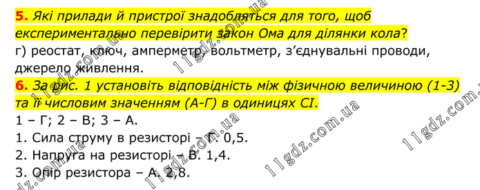5. Які прилади й пристрої знадобляться для того, щоб експериментально перевірити закон Ома для ділянки кола? г) реостат, ключ, амперметр, вольтметр, з’єднувальні проводи, джерело живлення. 6. За рис. 1 установіть відповідність між фізичною величиною (1-3) та її числовим значенням (А-Г) в одиницях CІ. 1 – Г; 2 – В; 3 – А. 1. Сила струму в резисторі – Г. 0,5. 2. Напруга на резисторі – В. 1,4. 3. Опір резистора – А. 2,8.