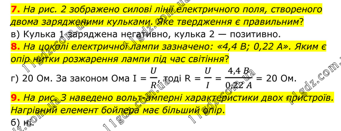 7. На рис. 2 зображено силові лінії електричного поля, створеного двома зарядженими кульками. Яке твердження є правильним? в) Кулька 1 заряджена негативно, кулька 2 — позитивно. 8. На цоколі електричної лампи зазначено: «4,4 В; 0,22 А». Яким є опір нитки розжарення лампи під час світіння? г) 20 Ом. За законом Ома I = U/R, тоді R = U/I = (4,4 B)/(0,22 A) = 20 Ом. 9. На рис. З наведено вольт-амперні характеристики двох пристроїв. Нагрівний елемент бойлера має більший опір. б) ні.