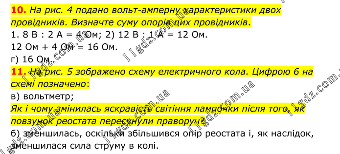 10. На рис. 4 подано вольт-амперну характеристики двох провідників. Визначте суму опорів цих провідників. 1. 8 В : 2 А = 4 Ом; 2) 12 В : 1 А = 12 Ом. 12 Ом + 4 Ом = 16 Ом. г) 16 Ом. 11. На рис. 5 зображено схему електричного кола. Цифрою 6 на схемі позначено: в) вольтметр; Як і чому змінилась яскравість світіння лампочки після того, як повзунок реостата пересунули праворуч? б) зменшилась, оскільки збільшився опір реостата і, як наслідок, зменшилася сила струму в колі.
