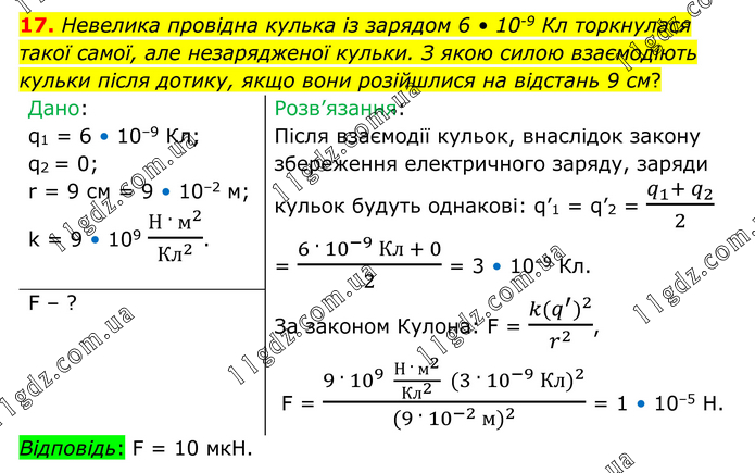 Невелика провідна кулька із зарядом 6 • 10-9 Кл торкнулася такої самої, але незарядженої кульки. З якою силою взаємодіють кульки після дотику, якщо вони розійшлися на відстань 9 см? Дано: q1 = 6 • 10–9 Кл; q2 = 0; r = 9 см = 9 • 10–2 м; k = 9 • 109 (Н · м^2)/〖Кл〗^2 . Розв’язання: Після взаємодії кульок, внаслідок закону збереження електричного заряду, заряди кульок будуть однакові: q’1 = q’2 = (q_1+ q_2)/2 = (6 · 10^(-9) Кл + 0)/2 = 3 • 10–9 Кл. За законом Кулона: F = (k(q^' )^2)/r^2 , F = (9 · 10^(9 ) (Н · м^2)/〖Кл〗^2 (3 · 10^(-9) Кл)^2)/((9 · 10^(-2) м)^2 ) = 1 • 10–5 Н. F – ? Відповідь: F = 10 мкН.
