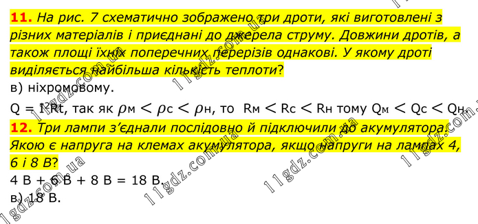 11. На рис. 7 схематично зображено три дроти, які виготовлені з різних матеріалів і приєднані до джерела струму. Довжини дротів, а також площі їхніх поперечних перерізів однакові. У якому дроті виділяється найбільша кількість теплоти? в) ніхромовому. Q = I2Rt, так як ρм < ρс < ρн, то Rм < Rс < Rн тому Qм < Qс < Qн. 12. Три лампи з’єднали послідовно й підключили до акумулятора. Якою є напруга на клемах акумулятора, якщо напруги на лампах 4, 6 і 8 В? 4 В + 6 В + 8 В = 18 В. в) 18 В.