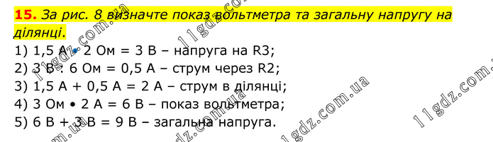 За рис. 8 визначте показ вольтметра та загальну напругу на ділянці. 1) 1,5 А • 2 Ом = 3 В – напруга на R3; 2) 3 В : 6 Ом = 0,5 А – струм через R2; 3) 1,5 А + 0,5 А = 2 А – струм в ділянці; 4) 3 Ом • 2 А = 6 В – показ вольтметра; 5) 6 В + 3 В = 9 В – загальна напруга.