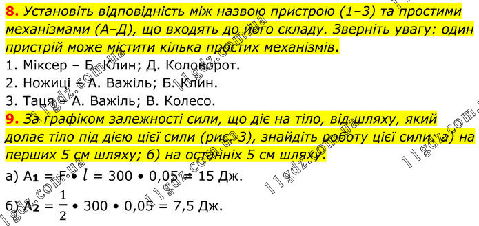 8. Установіть відповідність між назвою пристрою (1–3) та простими механізмами (А–Д), що входять до його складу. Зверніть увагу: один пристрій може містити кілька простих механізмів. 1. Міксер – Б. Клин; Д. Коловорот. 2. Ножиці – А. Важіль; Б. Клин. 3. Таця – А. Важіль; В. Колесо. 9. За графіком залежності сили, що діє на тіло, від шляху, який долає тіло під дією цієї сили (рис. 3), знайдіть роботу цієї сили: а) на перших 5 см шляху; б) на останніх 5 см шляху. а) А1 = F • l = 300 • 0,05 = 15 Дж. б) А2 = 1/2 • 300 • 0,05 = 7,5 Дж.
