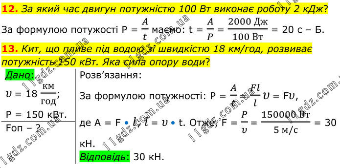12. За який час двигун потужністю 100 Вт виконає роботу 2 кДж? За формулою потужості Р = A/t маємо: t = A/P = (2000 Дж)/(100 Вт) = 20 с – Б. 13. Кит, що пливе під водою зі швидкістю 18 км/год, розвиває потужність 150 кВт. Яка сила опору води? Дано: υ = 18 км/год; Р = 150 кВт. Розв’язання: За формулою потужності: Р = A/t = Fl/l υ = Fυ, де A = F • l; l = υ • t. Отже, F = P/υ = (150000 Вт)/(5 м/с) = 30 кН. Відповідь: 30 кН. Fоп – ?