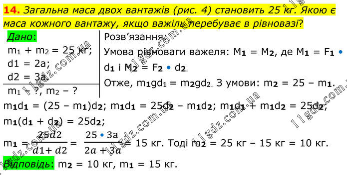 Загальна маса двох вантажів (рис. 4) становить 25 кг. Якою є маса кожного вантажу, якщо важіль перебуває в рівновазі? Дано: m1 + m2 = 25 кг; d1 = 2a; d2 = 3a. Розв’язання: Умова рівноваги важеля: M1 = M2, де М1 = F1 • d1 і M2 = F2 • d2. Отже, m1gd1 = m2gd2. З умови: m2 = 25 – m1. m1 – ?, m2 – ? m1d1 = (25 – m1)d2; m1d1 = 25d2 – m1d2; m1d1 + m1d2 = 25d2; m1(d1 + d2) = 25d2; m1 = 25d2/(d1+ d2) = (25 • 3a )/(2a + 3a) = 15 кг. Тоді m2 = 25 кг – 15 кг = 10 кг. Відповідь: m2 = 10 кг, m1 = 15 кг.