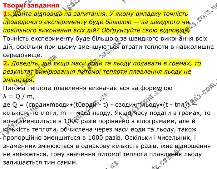 Творчі завдання 1. Дайте відповідь на запитання. У якому випадку точність проведеного експерименту буде більшою — за швидкого чи повільного виконання всіх дій? Обґрунтуйте свою відповідь. Точність експерименту буде більшою за швидкого виконання всіх дій, оскільки при цьому зменшуються втрати теплоти в навколишнє середовище. 2. Доведіть, що якщо маси води та льоду подавати в грамах, то результат вимірювання питомої теплоти плавлення льоду не зміниться. Питома теплота плавлення визначається за формулою λ = Q / m, де Q = (cводи•mводи•(t0води - t) - cводи•mльоду•(t - tпл)) — кількість теплоти, m — маса льоду. Якщо масу подати в грамах, то вона зменшиться в 1000 разів порівняно з кілограмами, але й кількість теплоти, обчислена через маси води та льоду, також пропорційно зменшиться в 1000 разів. Оскільки і чисельник, і знаменник змінюються в однакову кількість разів, їхнє відношення не змінюється, тому значення питомої теплоти плавлення льоду залишається тим самим.