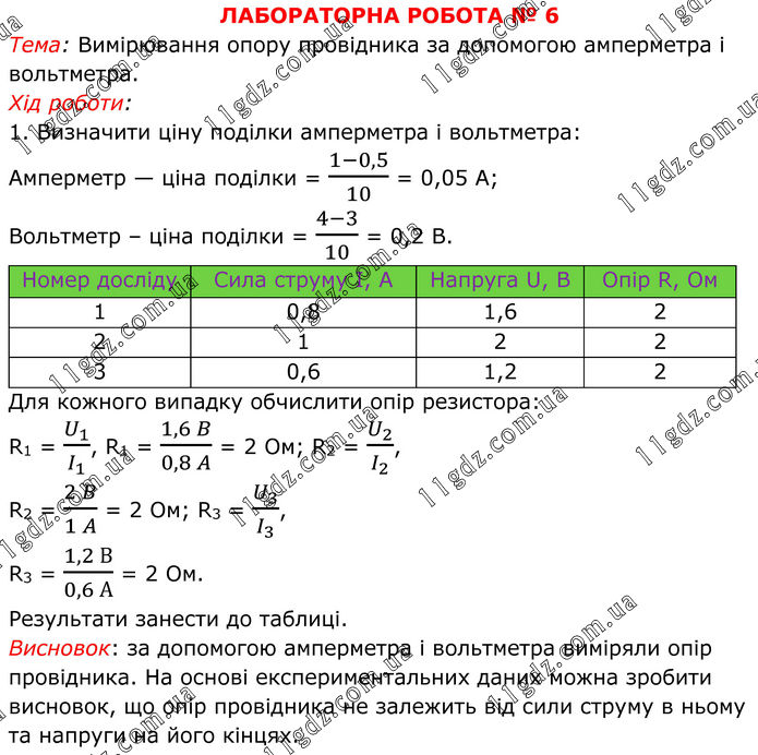 ЛАБОРАТОРНА РОБОТА № 6 Тема: Вимірювання опору провідника за допомогою амперметра і вольтметра. Хід роботи: 1. Визначити ціну поділки амперметра і вольтметра: Амперметр — ціна поділки = (1-0,5)/10 = 0,05 А; Вольтметр – ціна поділки = (4-3)/10 = 0,2 В. Для кожного випадку обчислити опір резистора: R1 = U_1/I_1 , R1 = (1,6 B)/(0,8 A) = 2 Ом; R2 = U_2/I_2 , R2 = (2 B)/(1 A) = 2 Ом; R3 = U_3/I_3 , R3 = (1,2 В)/(0,6 А) = 2 Ом. Результати занести до таблиці. Висновок: за допомогою амперметра і вольтметра виміряли опір провідника. На основі експериментальних даних можна зробити висновок, що опір провідника не залежить від сили струму в ньому та напруги на його кінцях.