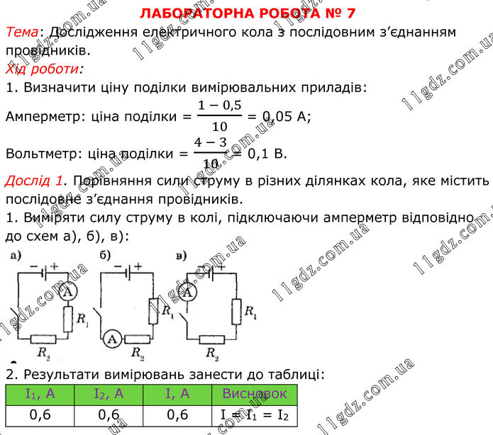 ЛАБОРАТОРНА РОБОТА № 7 Тема: Дослідження електричного кола з послідовним з’єднанням провідників. Хід роботи: 1. Визначити ціну поділки вимірювальних приладів: Амперметр: ціна поділки = (1 - 0,5)/10 = 0,05 A; Вольтметр: ціна поділки = (4 - 3)/10 = 0,1 В. Дослід 1. Порівняння сили струму в різних ділянках кола, яке містить послідовне з’єднання провідників. 1. Виміряти силу струму в колі, підключаючи амперметр відповідно до схем а), б), в): 2. Результати вимірювань занести до таблиці: