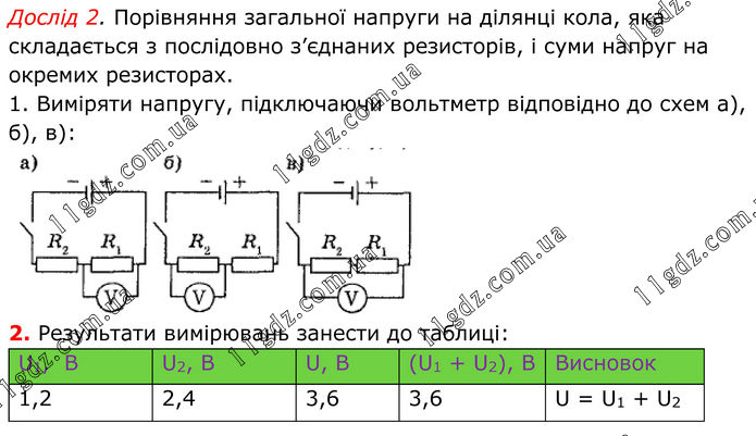 Дослід 2. Порівняння загальної напруги на ділянці кола, яка складається з послідовно з’єднаних резисторів, і суми напруг на окремих резисторах. 1. Виміряти напругу, підключаючи вольтметр відповідно до схем а), б), в): 2. Результати вимірювань занести до таблиці: