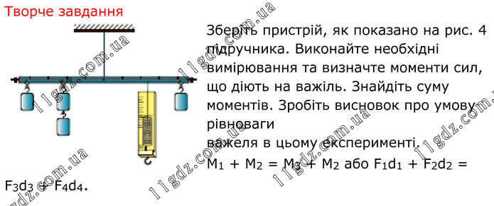Творче завдання Зберіть пристрій, як показано на рис. 4 підручника. Виконайте необхідні вимірювання та визначте моменти сил, що діють на важіль. Знайдіть суму моментів. Зробіть висновок про умову рівноваги важеля в цьому експерименті. М1 + М2 = М3 + М2 або F1d1 + F2d2 = F3d3 + F4d4.