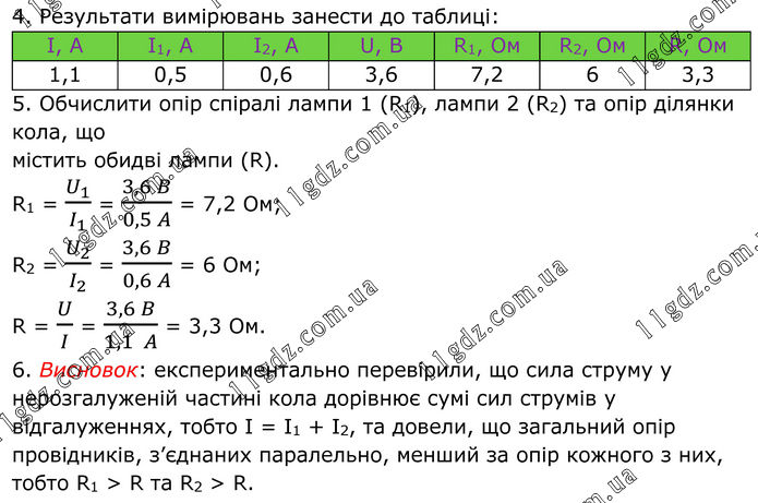 Творче завдання. План проведення експерименту, за допомогою якого можна визначити опір резистора (R2). 1. Скласти електричне коло за схемою та виміряти силу струму I1 на резисторі R1. 2. Відповідно до закону Ома розрахувати U1 = I1 • R. При паралельному з’єднанні U = U1 + U2. 3. Скласти електричне коло за схемою та виміряти силу струму І2 на резисторі R2. 4. Розрахувати опір резистора R2 : R2 = U_2/I_2 .