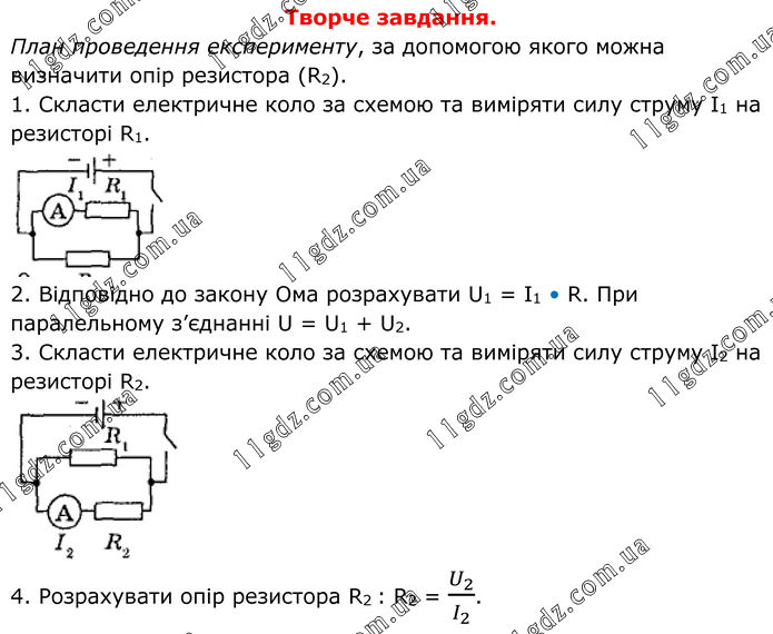 Творче завдання. План проведення експерименту, за допомогою якого можна визначити опір резистора (R2). 1. Скласти електричне коло за схемою та виміряти силу струму I1 на резисторі R1. 2. Відповідно до закону Ома розрахувати U1 = I1 • R. При паралельному з’єднанні U = U1 + U2. 3. Скласти електричне коло за схемою та виміряти силу струму І2 на резисторі R2. 4. Розрахувати опір резистора R2 : R2 = U_2/I_2 .