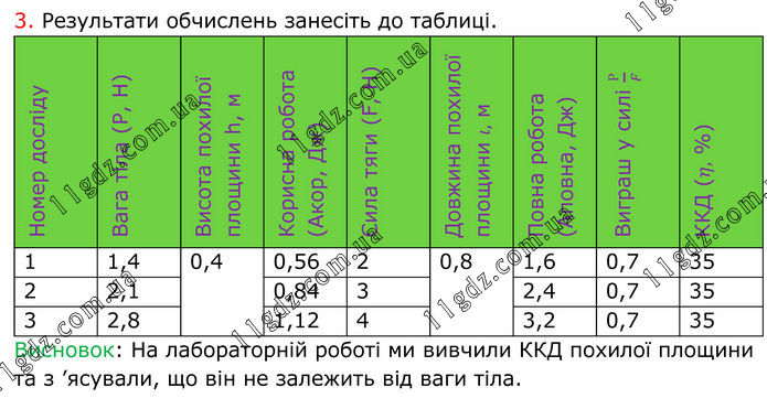 3. Результати обчислень занесіть до таблиці. Номер досліду Вага тіла (Р, Н) Висота похилої площини h, м Корисна робота (Акор, Дж) Сила тяги (F, H) Довжина похилої площини ι, м Повна робота (Аповна, Дж) Виграш у силі Р/F ККД (η, %) 1 1,4 0,4 0,56 2 0,8 1,6 0,7 35 2 2,1 0,84 3 2,4 0,7 35 3 2,8 1,12 4 3,2 0,7 35 Висновок: На лабораторній роботі ми вивчили ККД похилої площини та з ’ясували, що він не залежить від ваги тіла.