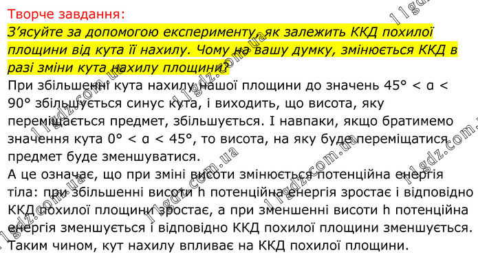 Творче завдання: З’ясуйте за допомогою експерименту, як залежить ККД похилої площини від кута її нахилу. Чому на вашу думку, змінюється ККД в разі зміни кута нахилу площини? При збільшенні кута нахилу нашої площини до значень 45° < α < 90° збільшується синус кута, і виходить, що висота, яку переміщається предмет, збільшується. І навпаки, якщо братимемо значення кута 0° < α < 45°, то висота, на яку буде переміщатися предмет буде зменшуватися. А це означає, що при зміні висоти змінюється потенційна енергія тіла: при збільшенні висоти h потенційна енергія зростає і відповідно ККД похилої площини зростає, а при зменшенні висоти h потенційна енергія зменшується і відповідно ККД похилої площини зменшується. Таким чином, кут нахилу впливає на ККД похилої площини.