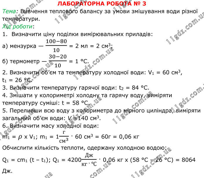 ЛАБОРАТОРНА РОБОТА № 3 Тема: Вивчення теплового балансу за умови змішування води різної темпе¬ратури. Хід роботи: 1. Визначити ціну поділки вимірюваль¬них приладів: а) мензурка — (100-80)/10 = 2 мл = 2 см3; б) термометр — (30-20)/10 = 1 °C. 2. Визначити об’єм та температуру хо¬лодної води: V1 = 60 см3, t1 = 26 °C. 3. Визначити температуру гарячої води: t2 = 84 °С. 4. Змішати у колориметрі холодну та гарячу воду, виміряти температуру су¬міші: t = 58 °С. 5. Переливши всю воду з колориметра до мірного циліндра, виміряти загаль¬ний об’єм води: V =140 см3. 6. Визначити масу холодної води: m1 = ρ x V1; m1 = 1г/〖см〗^3 · 60 см3 = 60г = 0,06 кг Обчислити кількість теплоти, одержа¬ну холодною водою: Q1 = cm1 (t – t1); Q1 = 4200Дж/(кг · ℃) · 0,06 кг х (58 °C – 26 °C) = 8064 Дж.