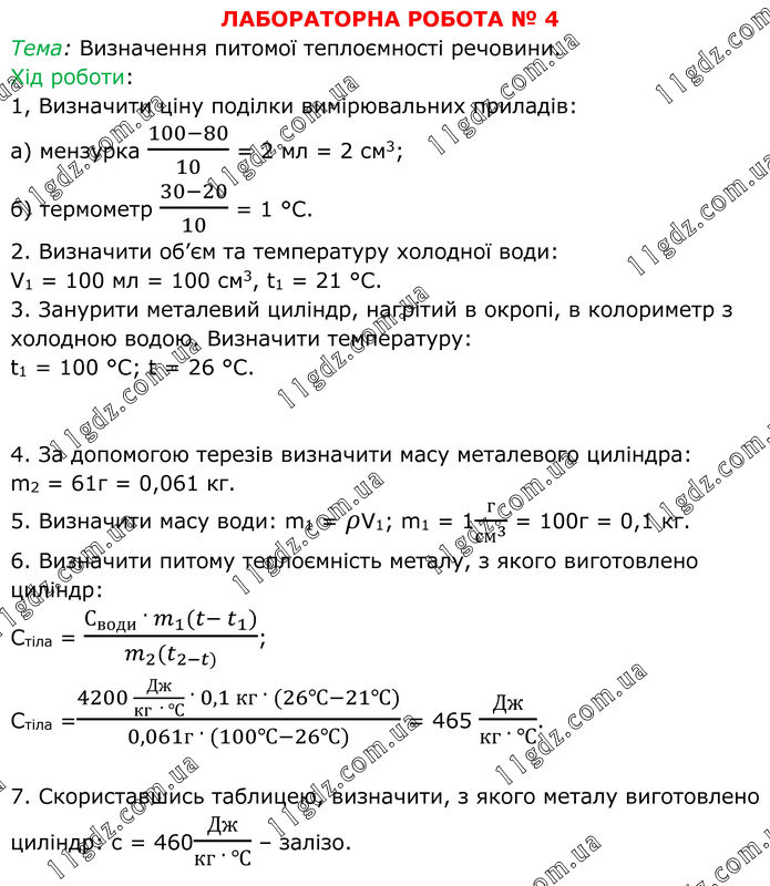 ЛАБОРАТОРНА РОБОТА № 4 Тема: Визначення питомої теплоєм¬ності речовини. Хід роботи: 1. Визначити ціну поділки вимірюваль¬них приладів: а) мензурка (100-80)/10 = 2 мл = 2 см3; б) термометр (30-20)/10 = 1 °C. 2. Визначити об’єм та температуру холодної води: V1 = 100 мл = 100 см3, t1 = 21 °C. 3. Занурити металевий циліндр, на¬грітий в окропі, в колориметр з холод¬ною водою. Визначити температуру: t1 = 100 °C; t = 26 °C.