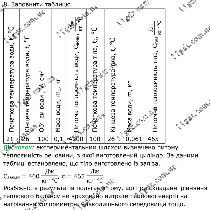 4. За допомогою терезів визначити масу металевого циліндра: m2 = 61г = 0,061 кг. 5. Визначити масу води: m1 = ρV1; m1 = 1г/〖см〗^3 = 100г = 0,1 кг. 6. Визначити питому теплоємність металу, з якого виготовлено циліндр: Стіла = (С_води · m_1 (t- t_1))/(m_2 (t_(2-t)) ); Стіла =(4200 Дж/(кг · ℃) · 0,1 кг · (26℃-21℃))/(0,061г · (100℃-26℃)) = 465 Дж/(кг · ℃). 7. Скориставшись таблицею, визначи¬ти, з якого металу виготовлено циліндр: с = 460Дж/(кг · ℃) – залізо. Висновок: експериментальним шляхом визначено питому теплоємність речо¬вини, з якої виготовлений циліндр. За даними таблиці встановлено, що тіло виготовлено із заліза. Сзалізо = 460 Дж/(кг · ℃), с = 465 Дж/(кг · ℃). Розбіжність результатів полягає в тому, що при складанні рівняння теплового балансу не враховано витрати теплової енергії на нагрівання колориметра, навколишнього середовища тощо.