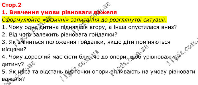 1. Вивчення умови рівноваги важеля Сформулюйте «фізичні» запитання до розглянутої ситуації. 1. Чому одна дитина піднялася вгору, а інша опустилася вниз? 2. Від чого залежить рівновага гойдалки? 3. Як зміниться положення гойдалки, якщо діти поміняються місцями? 4. Чому дорослий має сісти ближче до опори, щоб урівноважити дитину? 5. Як маса та відстань від точки опори впливають на умову рівноваги важеля?