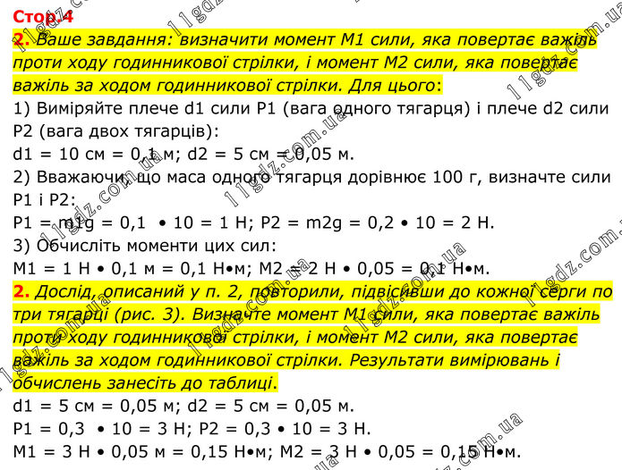 2. Ваше завдання: визначити момент M1 сили, яка повертає важіль проти ходу годинникової стрілки, і момент M2 сили, яка повертає важіль за ходом годинникової стрілки. Для цього: 1) Виміряйте плече d1 сили P1 (вага одного тягарця) і плече d2 сили P2 (вага двох тягарців): d1 = 10 см = 0,1 м; d2 = 5 см = 0,05 м. 2) Вважаючи, що маса одного тягарця дорівнює 100 г, визначте сили P1 і P2: Р1 = m1g = 0,1 • 10 = 1 Н; P2 = m2g = 0,2 • 10 = 2 Н. 3) Обчисліть моменти цих сил: М1 = 1 Н • 0,1 м = 0,1 Н•м; М2 = 2 Н • 0,05 = 0,1 Н•м. 2. Дослід, описаний у п. 2, повторили, підвісивши до кожної серги по три тягарці (рис. 3). Визначте момент M1 сили, яка повертає важіль проти ходу годинникової стрілки, і момент M2 сили, яка повертає важіль за ходом годинникової стрілки. Результати вимірювань і обчислень занесіть до таблиці. d1 = 5 см = 0,05 м; d2 = 5 см = 0,05 м. Р1 = 0,3 • 10 = 3 Н; P2 = 0,3 • 10 = 3 Н. М1 = 3 Н • 0,05 м = 0,15 Н•м; М2 = 3 Н • 0,05 = 0,15 Н•м.