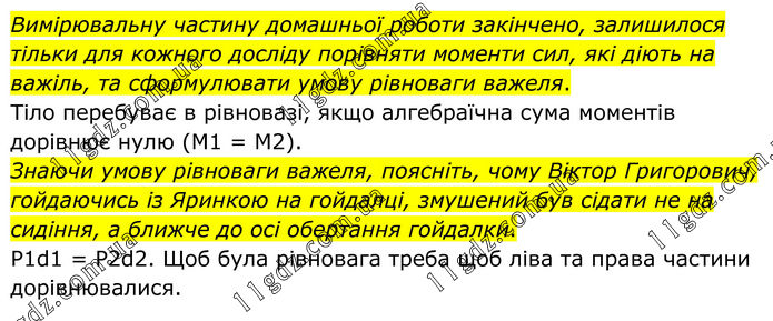 Вимірювальну частину домашньої роботи закінчено, залишилося тільки для кожного досліду порівняти моменти сил, які діють на важіль, та сформулювати умову рівноваги важеля. Тіло перебуває в рівновазі, якщо алгебраїчна сума моментів дорівнює нулю (М1 = М2). Знаючи умову рівноваги важеля, поясніть, чому Віктор Григорович, гойдаючись із Яринкою на гойдалці, змушений був сідати не на сидіння, а ближче до осі обертання гойдалки. P1d1 = P2d2. Щоб була рівновага треба щоб ліва та права частини дорівнювалися.